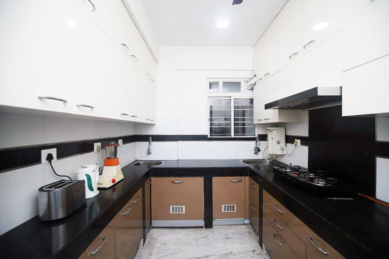 Gallary Kitchen is ideally suited for small space, it comprises of two parallel walls opposite to each other for countertops, cabinets and appliances.